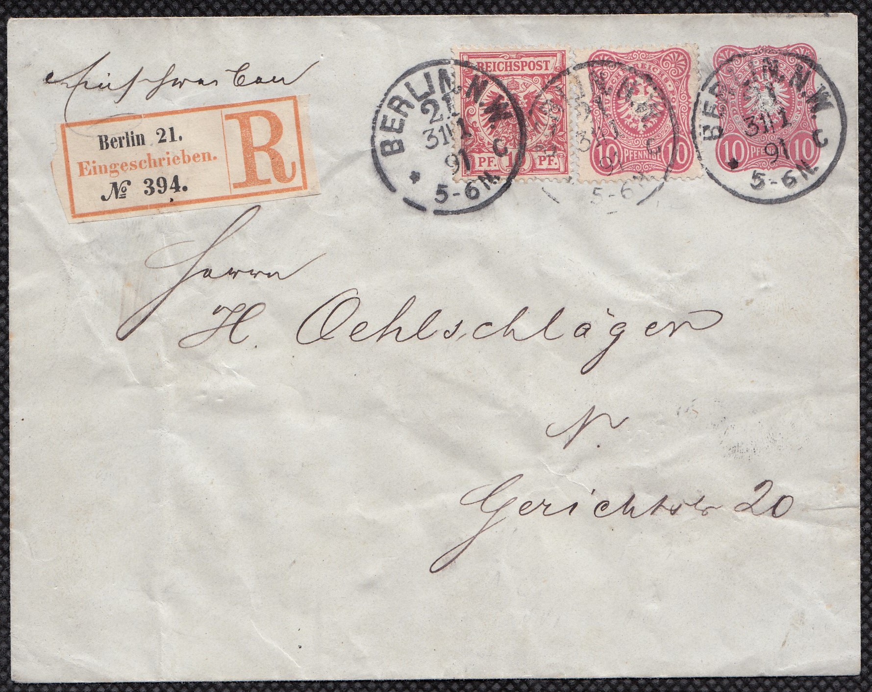 Ganzsache 10 Pfennig und ZuF 10 Pfge und 10 Pf. Krone&Adler MiF auf R-Ortsbrief BERLIN NW 21 31.1.1891 Sehr seltene MiF dreier Ausgaben, zudem am Letzttag der Pfennig-/Pfennige-Ausgabe |