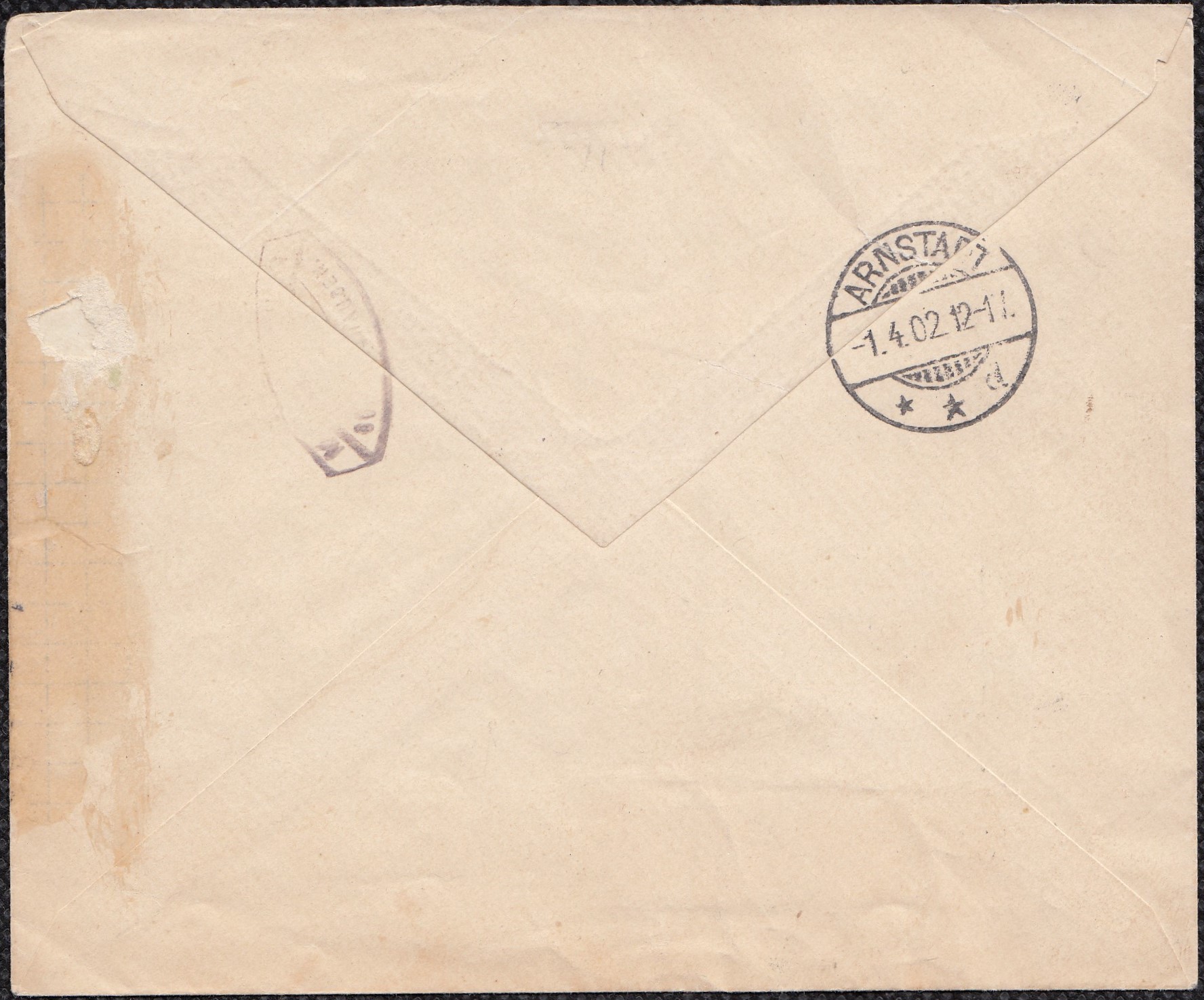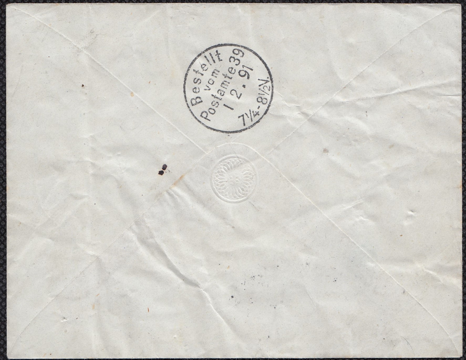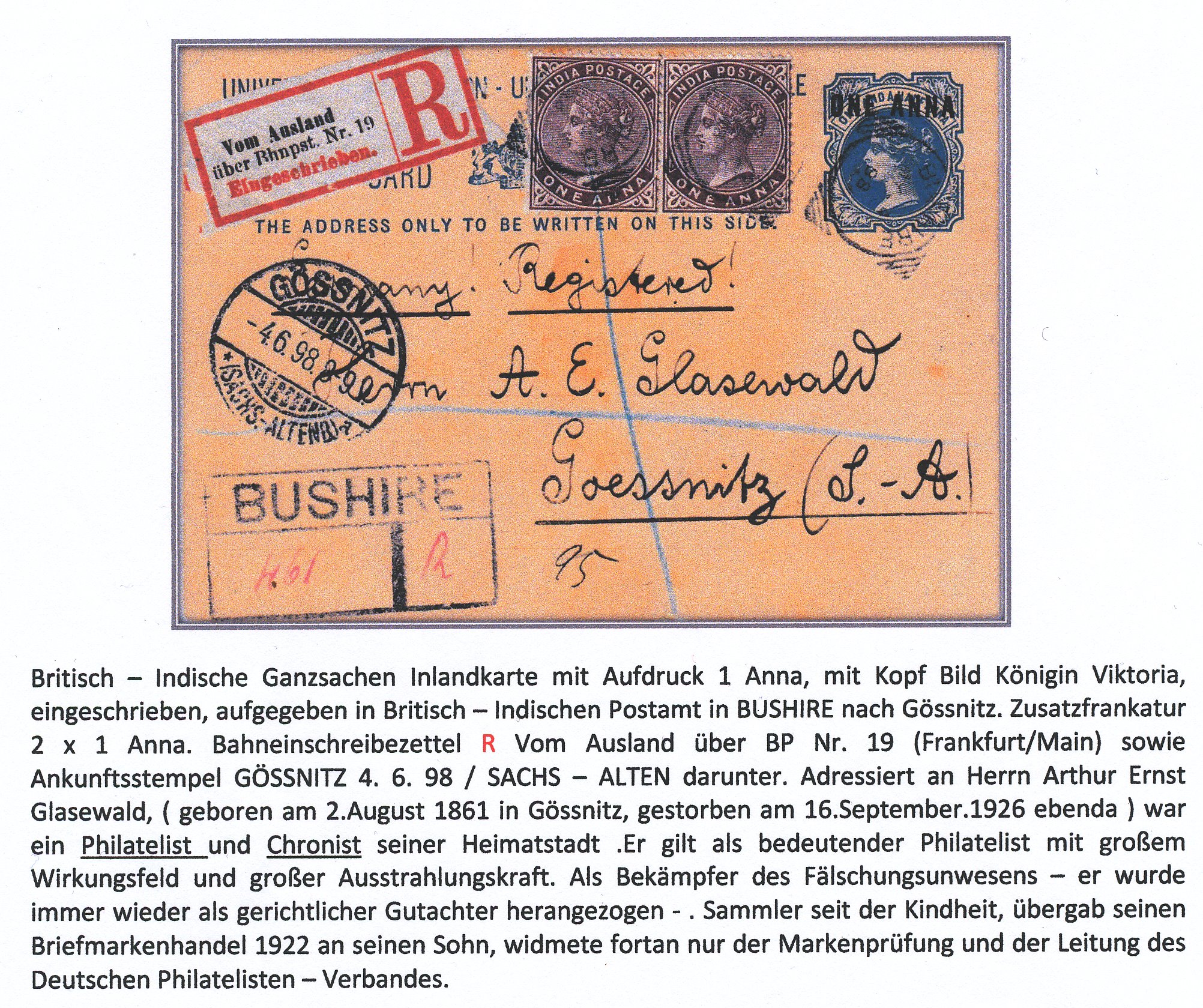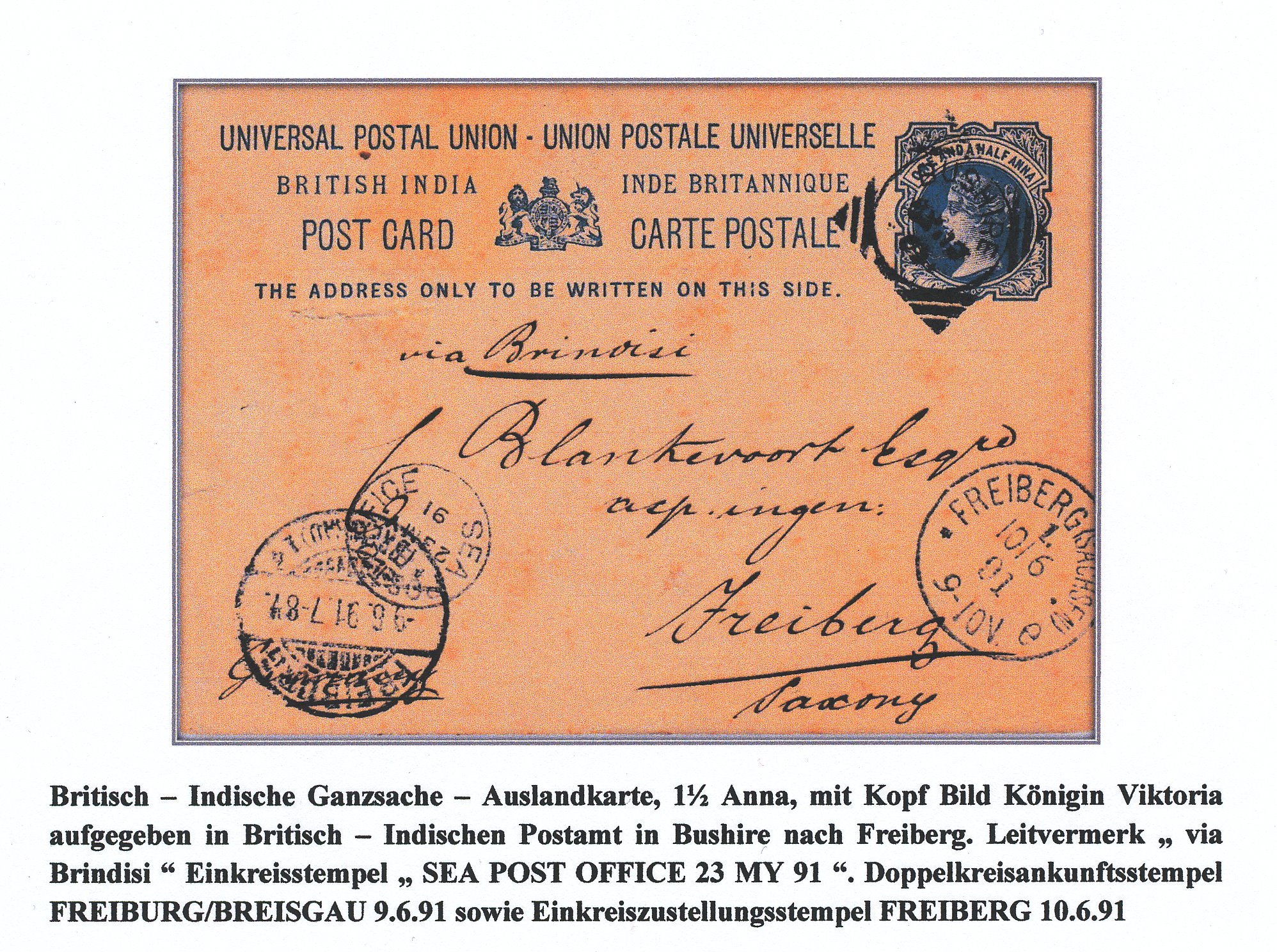 In BUSHIRE entwertet und über Brindisi gelaufen, zunächst nach Freiburg (Breisgau) zugestellt, dann Irrtum erkannt und nach Freiberg geschickt. Herr Schubert kann ergänzen: das Schiff müsste die Malwa gewesen sein, die Bombay am 16.05.1891 verließ und am 22.05.1891 in Aden ankam. Dort wird sie u.a. Post aufgenommen haben und einen Tag später am 23.05.1891 in Richtung Suez weitergefahren sein. Somit wäre das Stempeldatum mit Aden als Zuleitungsort erklärbar. Der verwendete Stempel wäre dann der D17 des Stempelsets B |