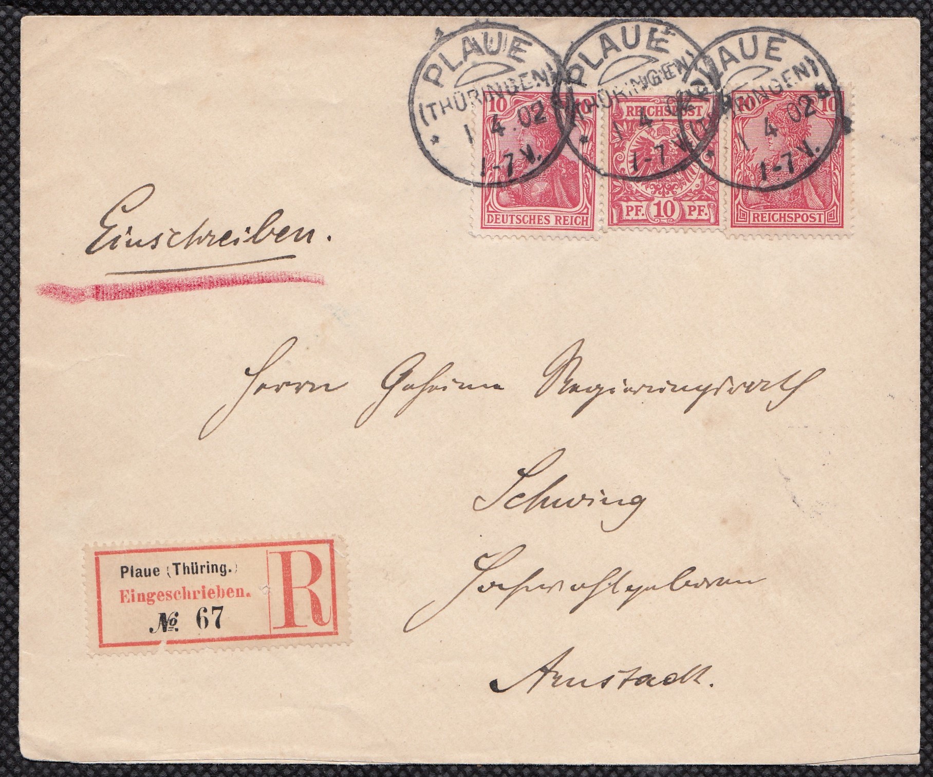 10 Pf. Krone&Adler mit 10 Pf. Germania sowohl der Reichspost-Ausgabe und der Ausgabe Deutsches Reich ohne Wz. auf R-Fernbrief ab PLAUE (THÜRINGEN) 1.4.1902 Gleichzeitig Ersttag für DR 10 Pf. |