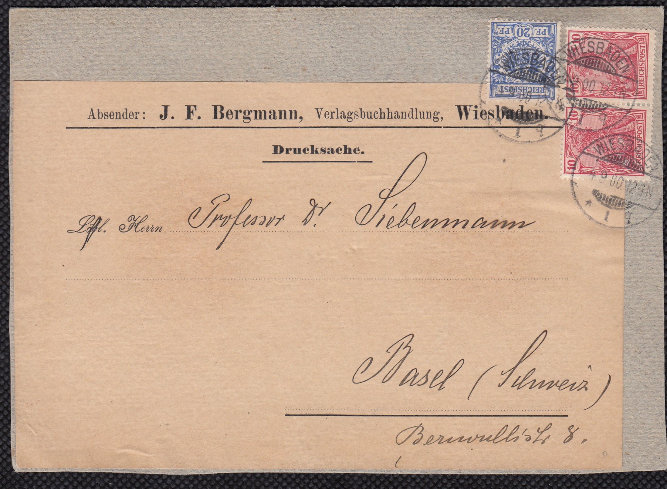 20 Pf. Krone&Adler in MiF mit 2x 10 Pf. Reichspost Germania auf komplettem Adressträger einer schweren Drucksache (von 350 bis 400 gr.) ins Ausland nach Basel (Schweiz) ab WIESBADEN 4.9.1900. Absender Verlagsbuchhandlung läßt eine Buchversendung vermuten. |