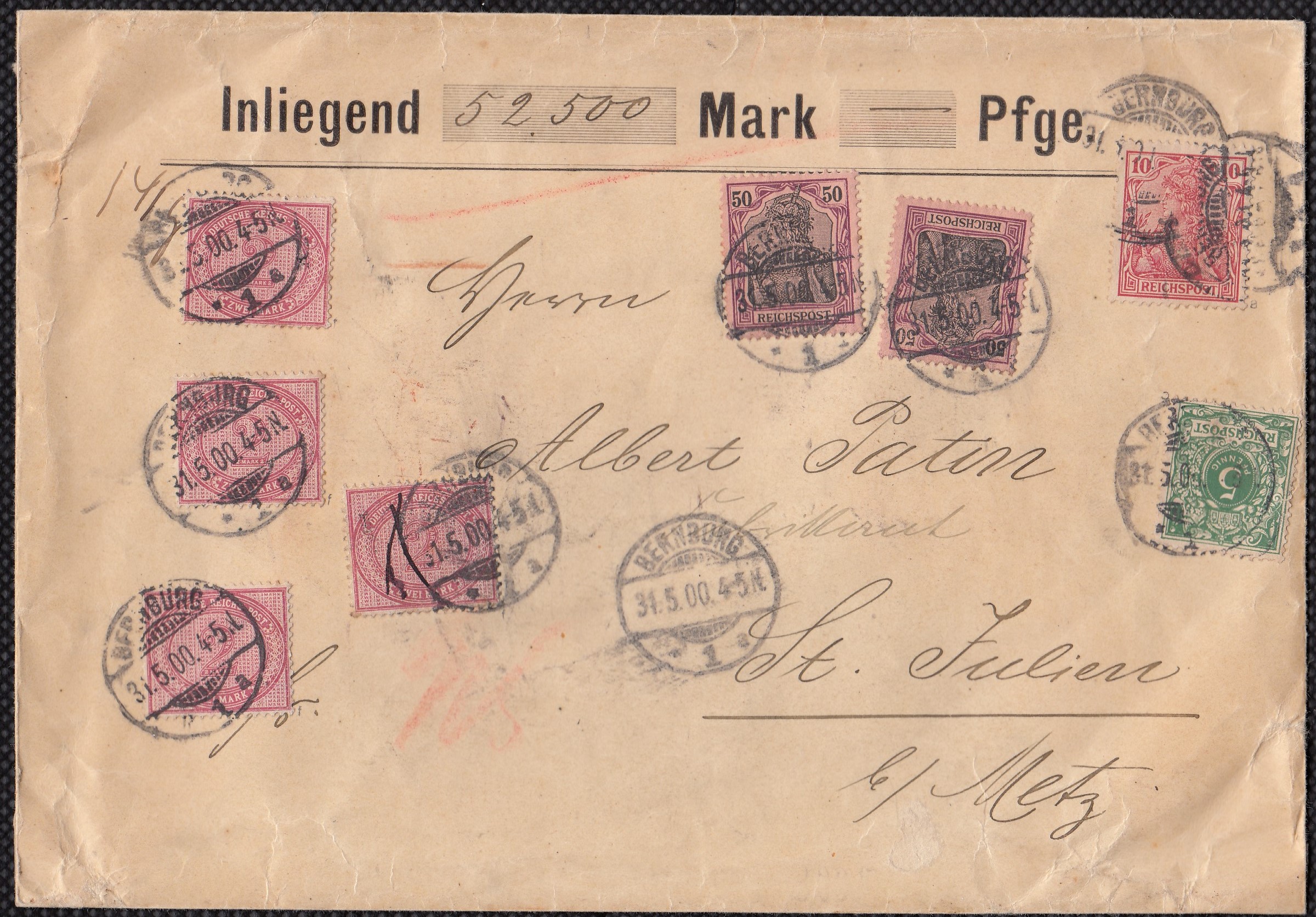 Wertbrief über 52.000 Mark von BERNBURG 31,5,1900 nach St. Julien (Metz) frankiert 4x 2 Mark (37), 2x 50 Pf. und 10 Pf. Reichspost Germania sowie 5 Pf. Krone&Adler. Gebühren: 5 Pf./300 Mark Wertgebühr -> 8,75 dazu Brief bis 250 gr. 20 Pf. und 20 Pf. Zustellgebühr macht 9,15 RM. Hier tarifgerecht freigemacht. Spätdatum für die MiNr. 37 (!). |