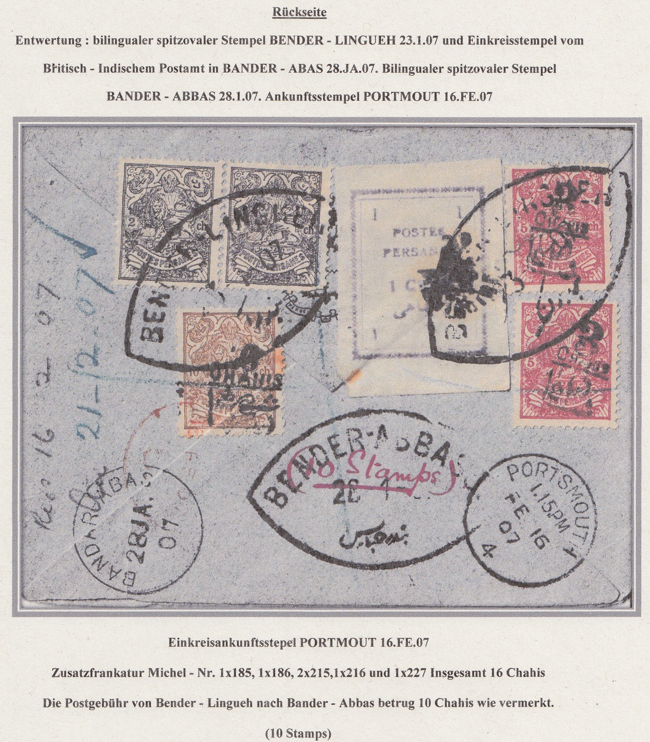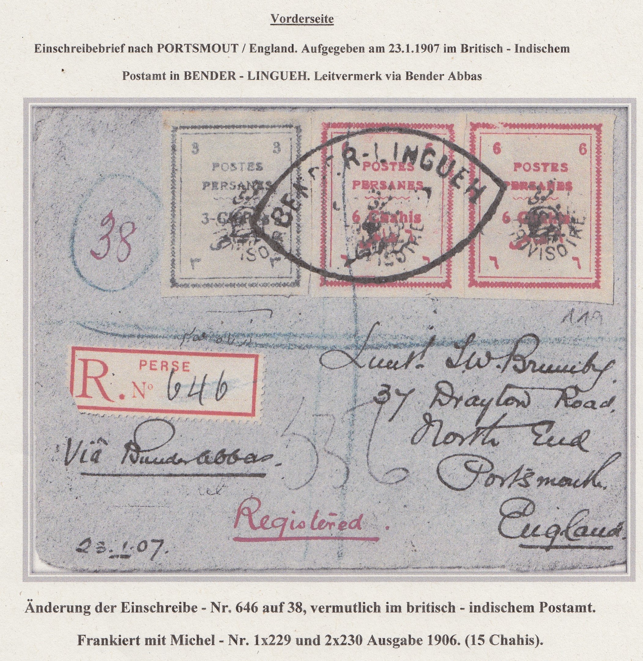Einschreibebrief fankiert vorderseitig mit 15 Chahi (MiNr. 229 und 2x 230). Aufgegeben in BENDER-LINGUEH 23.1.07 mit Leitvermerk Bender Abbas (Landweg), dazu rückseitig BANDER-ABAS 28.JA.07 angebracht auf weiterer Frankatur (MiNr. 185, 186, 2x 216 und 227) und Ankunftstempl PORTSMOUTH 16 Fe. 07. Rückseite Frankatur ergibt 16 Chahi, was 1 Chahi Überfrankatur bedeutet. Einschreibzettel abgeändert von "646" auf "38", vermutlich im britsch-indischen Aufgabe-Postamt. |