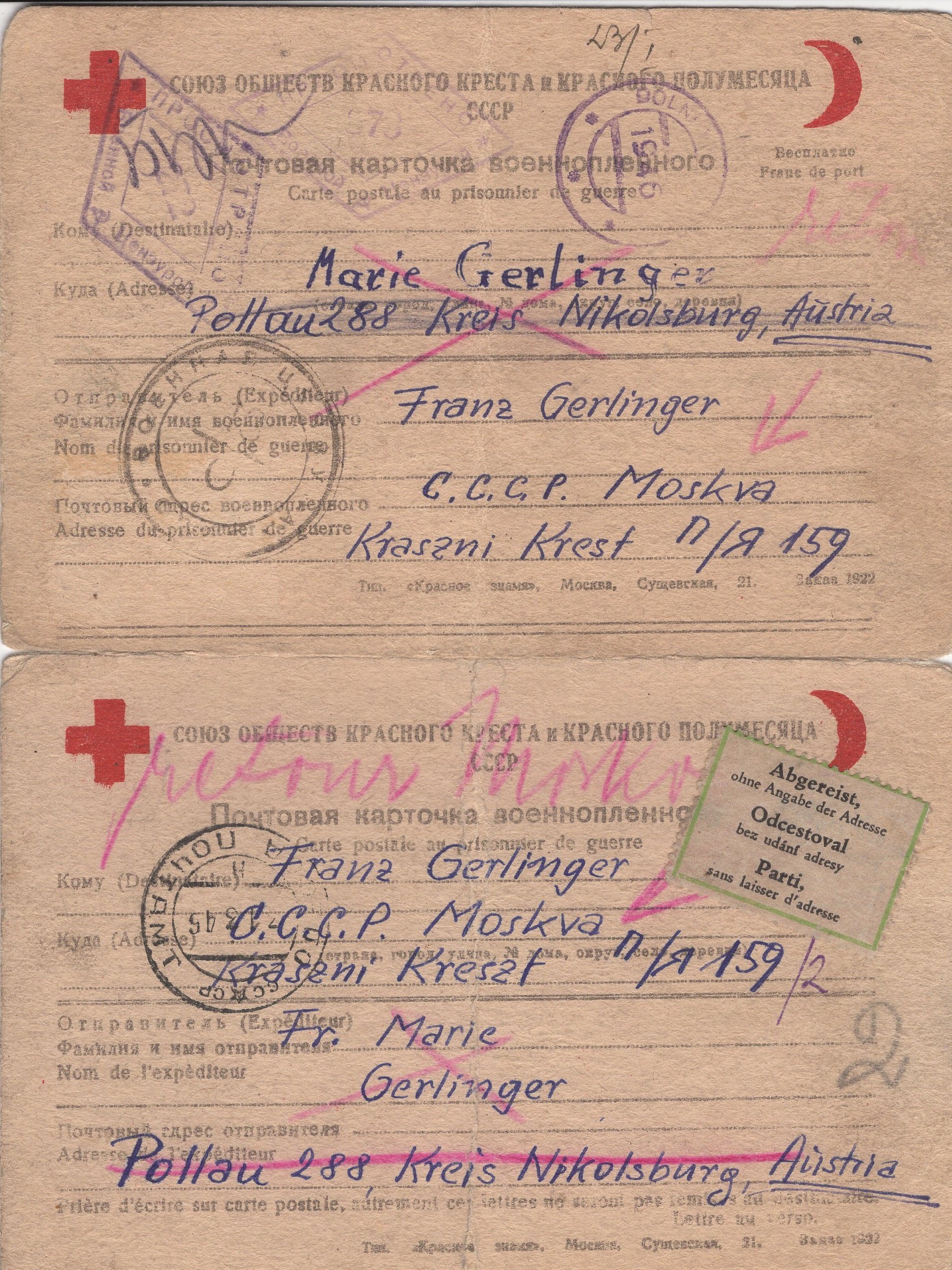 Karte ohne Datum von Franz Gerlinger aus dem Lager mit der Postfachnummer 159 in Odessa an seine Frau Marie Gerlinger in Pollau 288 Kreis Nikolsburg. Auf dem Antwortteil sind vier Stempel abgeschlagen: Zwei Rautenstempel; davon der mit den handschriftlichen Initialen (Bleistift) und der Prüfernummer 252 ganz rechts und daneben mit der Prüfernummer 253 (vermutlich nach Rücksendung im Lager mit der Postfachnummer 159/2 abgeschlagen). Die Karte konnte Frau Gerlinger in Pollau Anfang 1946 nicht zugestellt werden. Wurde dann von Dolní Vestonice (Zweikreisstempel; mit Steg und Datum von 1946) in der Südmährischen Region, (Tschechien) mit dem Aufkleber (Abgereist) versehen wieder zurückgesandt. Dolní Vestonice liegt 10 km nördlich von Mikulov (Nikolsburg). In Odessa erfolgte der Abschlag des Ortsaufgabestempels des Postamt Odessa mit dem Datum vom 31.3.1946 siehe Antwortteil in Höhe der Adresse von Franz Gerlinger. Der Doppelkreisstempel von Odessa ist deutlich seltener zu finden als der Doppelkreisstempel von Moskau. Der Zensurstelle in Moskau wurden aus mehreren Regionen in der Sowjetunion die Post der deutschen Kriegsgefangenen zur Prüfung zugestellt. Es gibt eine Vielzahl von Varianten des Doppelkreisstempels von Moskau. |