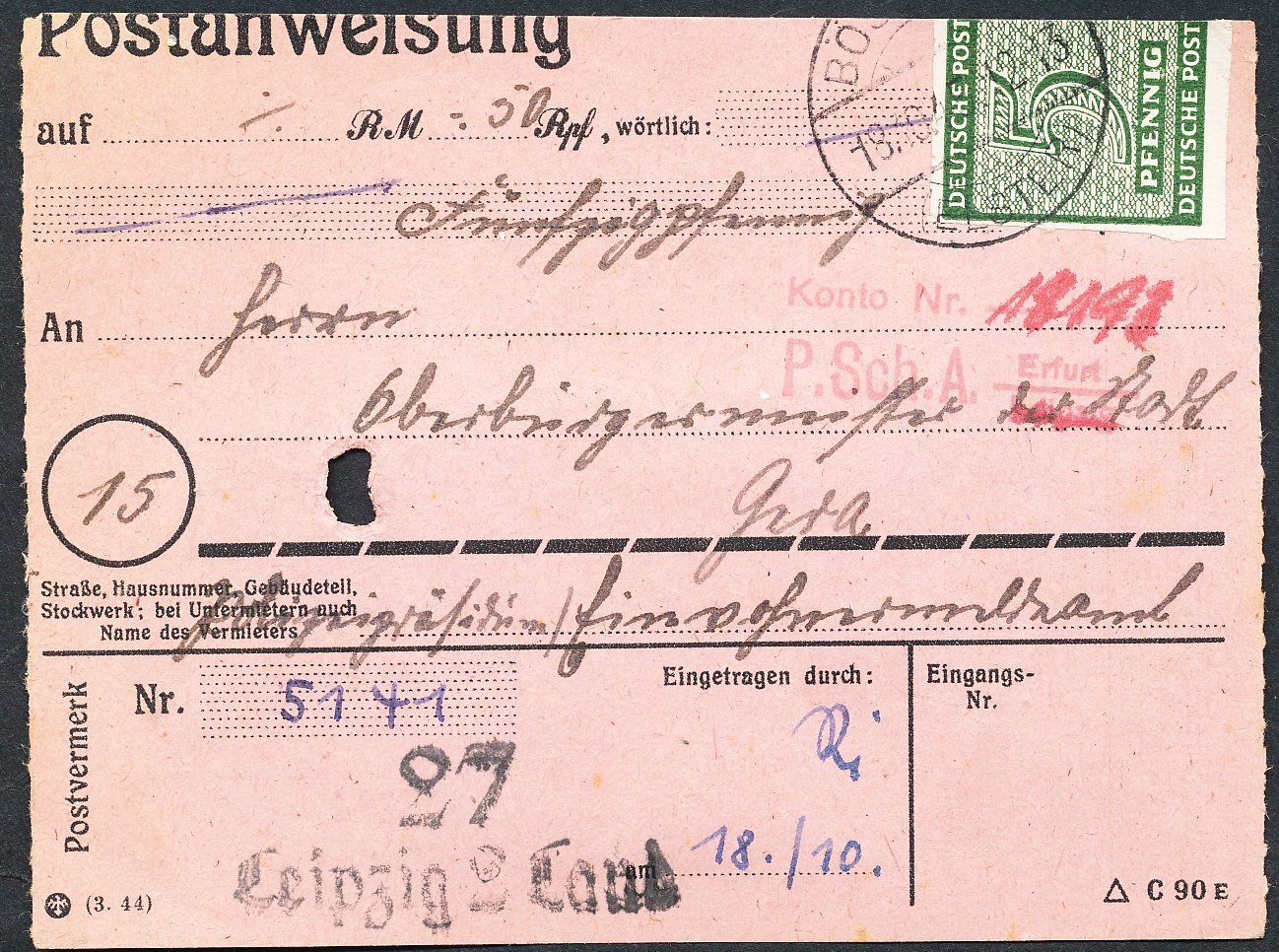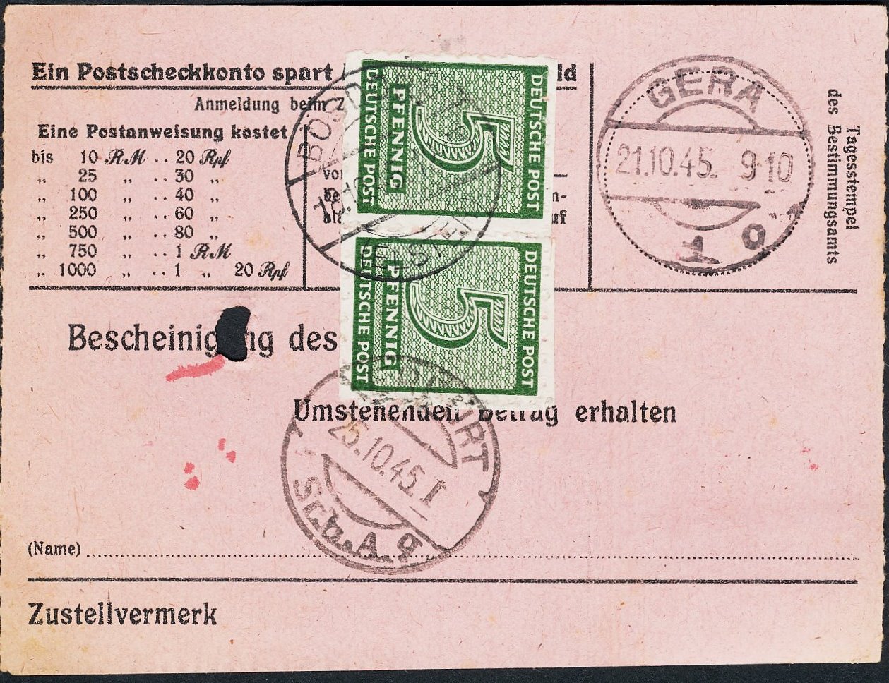 5 Pf. West-Sachsen mit Postmeistertrennung von GASCHWITZ, hier auf Postanweisung bis 10,00 RM (1. Tarifstufe) verwendet ab BÖSDORF (ELSTER) 18.10.45 12-13, waagerechtes Paar vorderseitig (stark weggeschnitten) und rückseitig (einwandfrei). Für den Empfänger wurde ein Konto beim Postscheckamt Erfurt erkannt (siehe vorderseitig roten L2 mit eingesetzter Kontonummer). Die ursprüngliche Postanweisung wurde über Gera an das PSchA Erfurt geleitet. Dort wurde sie wie eine Zahlkarte behandelt, der Zahlbetrag dem Konto gutgeschrieben und der Adressteil nach Buchung weggeschnitten. Es ist damit höher frankiert als für eine Zahlkarte erforderlich. Extrem seltene Kombination aus schon bereits seltener Verwendung auf Postformular einer Postmeistertrennung mit Besonderheit der postalischen Umwidmung. |